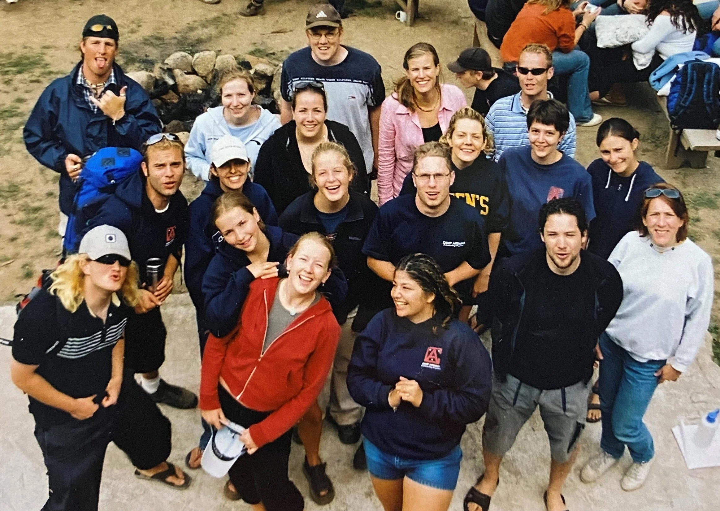 (2) A group of smiling staff at the campfire site in the early 2000s.