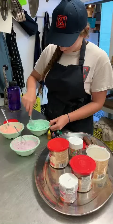(23) Steph mixing frosting in the kitchen.