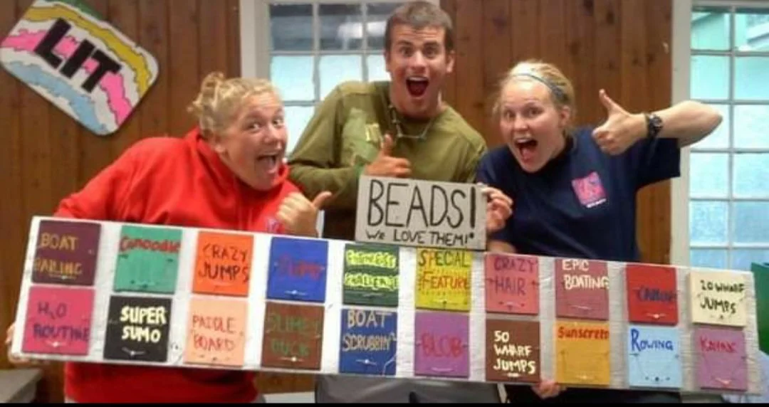 (3) Some lifeguards creating a chart to feature beads at the waterfront.